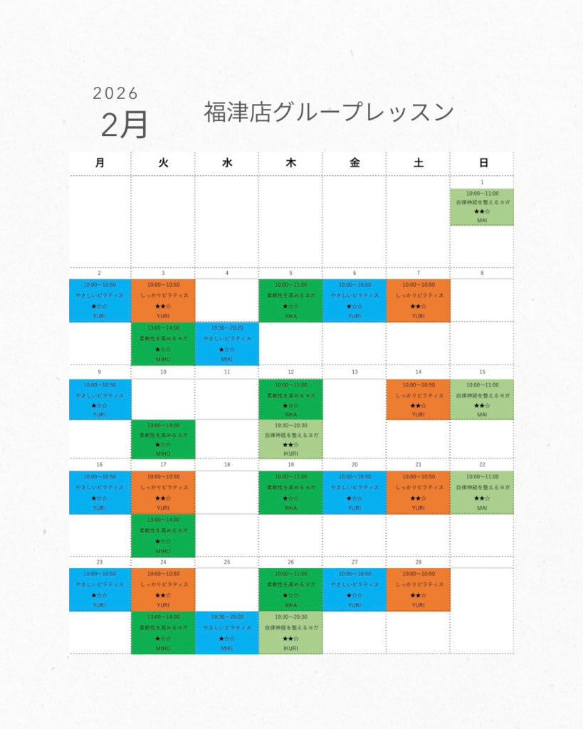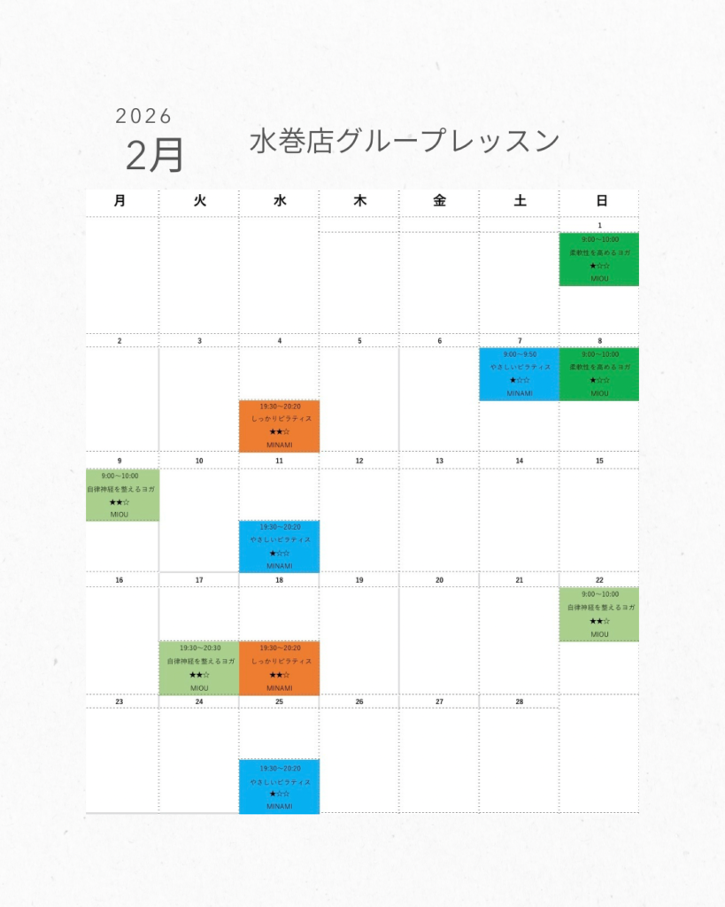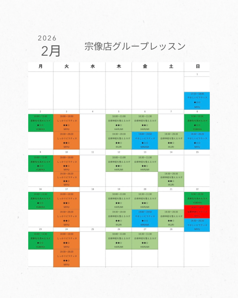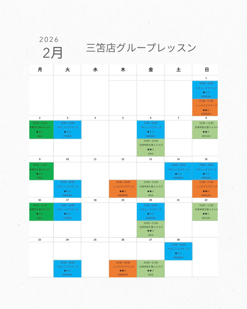 2月MINORI PILATES各店舗のグループレッスンスケジュールです!